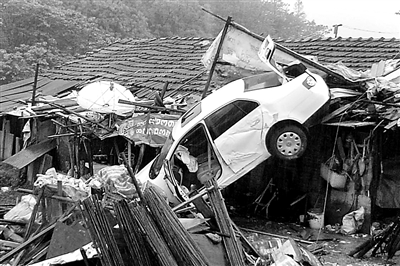 昨日上午,記者趕到現(xiàn)場看到,一輛“受傷”的白色轎車車頭朝下,車尾朝上,倒立著“掛”在民房的屋頂上,轎車車頭撞得面目全非,車身兩側(cè)凹陷,車內(nèi)兩個安全氣囊也完全打開(見圖)。民房旁邊,一根水泥電桿攔腰被撞斷,地上還散落著汽車零部件,不少路人冒雨在看稀奇。