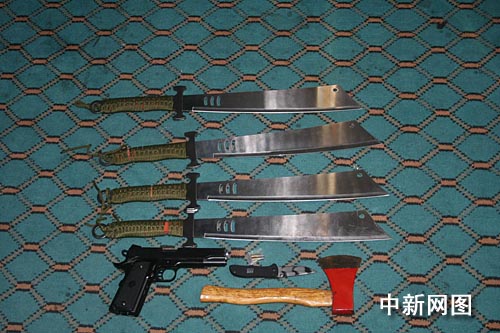 一切部署完畢后,4時(shí)40分,武裝民警分別破門(mén)而入,其中一間房?jī)?nèi),8男1女聚集在一起正在賭賻和吸毒,另一間房?jī)?nèi)1名嫌疑人還在呼呼大睡。這伙人還沒(méi)來(lái)得及反抗,全部束手就擒。警方在兩間房?jī)?nèi)搜出一把仿“五四”式手槍及子彈兩發(fā),另有6把砍刀和1把匕首。