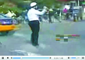 視頻于3天前出現(xiàn)在優(yōu)酷網(wǎng)上。打開(kāi)視頻,戴白頭盔、穿藍(lán)制服的男子在繁忙的路口指揮交通。