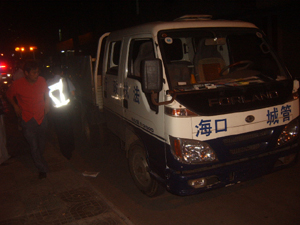 前晚8時(shí)許,在海口丘海一橫路家福飯店旁,農(nóng)民工黃萬(wàn)元一家三口在騎電動(dòng)車去醫(yī)院看病的途中,被一輛車身上印有“行政執(zhí)法”字樣的1.25小型卡車撞倒。事故發(fā)生后,肇事車輛并未停下,而是在周圍市民的叫喊聲中加速逃離現(xiàn)場(chǎng)。余先生是這起交通事故的目擊者之一。