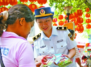 昨日上午10時(shí)左右,一個(gè)個(gè)身著嶄新的天藍(lán)色上衣、墨綠色的長(zhǎng)褲,精神飽滿的城管隊(duì)員在北京路、上下九步行街、天河城廣場(chǎng)附近街頭以及全市各區(qū),踏著整齊步伐,微笑著向沿路市民派發(fā)宣傳冊(cè),耐心地解答市民的疑問,為美麗的羊城增添了一道亮麗的風(fēng)景線。