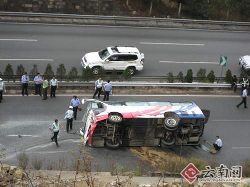 18日下午1點(diǎn)45分,安楚高速公路昆明至楚雄方向K128+500米處(孔家莊隧道出去1公里)發(fā)生一起重大交通事故,一輛從下關(guān)開(kāi)往昆明載有29人的中型客車發(fā)生側(cè)翻,當(dāng)場(chǎng)死亡1人,28人受傷,其中重傷1人。事故發(fā)生后,交警部門對(duì)楚雄至昆明方向的高速路實(shí)施了封閉,記者去現(xiàn)場(chǎng)只能從320國(guó)道繞行至山上的小路,站在在距離事故現(xiàn)場(chǎng)約30米的山坡上,記者看到在開(kāi)往昆明方向的高速路上,一輛客車側(cè)翻在路中間,雖是開(kāi)往昆明方向,但車頭卻調(diào)轉(zhuǎn)了朝著相反方向。凹陷的車頭上,擋風(fēng)玻璃像蜘蛛網(wǎng)一樣滿是裂痕,右側(cè)有個(gè)很大的窟窿,車身旁邊一道長(zhǎng)長(zhǎng)的劃痕非常明顯,車身下漏了一大灘汽油,一塊標(biāo)有大理兩個(gè)字的白色牌子飛到了距離客車有5、60米的地方。這時(shí)交警部門正在做現(xiàn)場(chǎng)勘查,在汽油上散上了沙子。 “嘭”,我當(dāng)時(shí)聽(tīng)到一聲巨響,跑出來(lái)一看,就看見(jiàn)一輛客車翻在坡底的高速路上,有個(gè)人被甩出了車外躺在地上一動(dòng)不動(dòng),其他的乘客在車上哭的哭,喊的喊。”高速路旁的楚雄大瓦房村的一位村民目睹了車禍時(shí)的情景。附近一位路過(guò)的駕駛員猜測(cè)說(shuō),從擋墻在撞擊的痕跡上看,客車可能是撞上可擋墻后,又反彈回來(lái),駕駛員急忙打方向盤(pán),車子就來(lái)了個(gè)360度大轉(zhuǎn)身后翻倒在地。“這段路過(guò)了隧道后,因?yàn)槭窍缕侣范,不少大車司機(jī)踩剎車時(shí)會(huì)不停地淋水,所以路面比較滑,司機(jī)車速稍一快就容易出事!