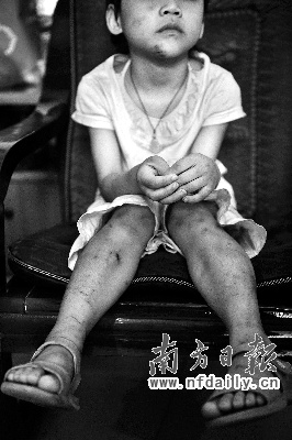 “身上還疼”,心怡見到記者時說。昨日下午,記者在廣州市花都區(qū)政府附近某幼兒園見到了她。其臉上有7處長短不一的傷痕,腦門上的一處還出血,下巴處硬幣大小的瘀傷分外明顯,“這是媽媽拉我,我倒在地上時摔的”。她的兩條胳膊同樣是傷痕累累,右手腕腫脹變形,腿和腳上傷痕密集,右腿上一處約2厘米長的傷痕已經(jīng)淤血化膿。當幼兒園老師掀起心怡的衣服時,其背部、臀部成片的紅色條狀傷痕顯露出現(xiàn)。有的傷痕明顯是不同時間毆打,舊傷未愈又添新痕。記者粗略計算,外傷不止70處。