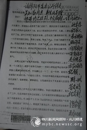“請綿陽市委辦公廳轉(zhuǎn)告吳加勤同志,來信及承贈(zèng)郵冊均已收到,十分感謝。謹(jǐn)向她和她幸存的家人表示親切的問候,向陳家壩所有的父老鄉(xiāng)親表示良好的祝愿。附一簽名的紀(jì)念封。溫家寶 五月十七日”。(楊亦萱)