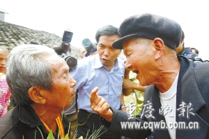 “劉東娃(劉召回的小名),讓我摸摸你頭頂的傷疤,好沒有?”只見一位年齡相仿的老人擠進人群,將雙手罩向了劉的后腦,撥開層層白發(fā),撫摸著一道一寸來長的疤痕驚喜地說,“沒錯,就是東娃!你頭上這道傷疤,是我們一起下河摸魚時摔傷的,你還記得不?”