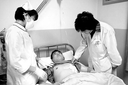 昨天晚上,記者聞訊后迅速趕到西京醫(yī)院,在急診科三樓的病房里,急診外科的醫(yī)生朱金文躺在病床上,他的左側胸部上貼著一大塊白色的紗布,胳膊扎著一根針管正在輸液。據目擊者說,下午4時許,一名五十多歲的病人在幾個人的陪同下來到急診外科就診,說是在交通事故中受了傷。醫(yī)生就開始給病人做檢查,可病人的手一直捂著胸部,拒絕檢查。此時,不知何因,病人打了醫(yī)生兩拳。醫(yī)生并未發(fā)火,隨后停下檢查,過了一會兒又過去查看病人。病人突然情緒失控,拿出一把小刀朝醫(yī)生胸部捅去,醫(yī)生趕緊用手壓住傷口跑到急救室。