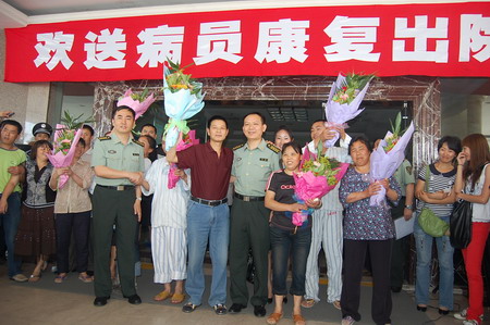 下午三點半,9名已康復的傷員在醫(yī)務工作者和家屬的陪同下走出了外科樓。四川省衛(wèi)生廳副廳長趙萬華與該醫(yī)院部分領導向傷員們贈送了鮮花,并握手、拍照留念。