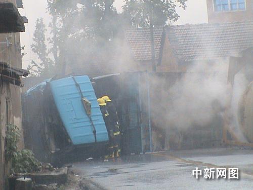 消防隊(duì)員趕到現(xiàn)場(chǎng)時(shí),只見(jiàn)一輛槽罐車側(cè)翻橫在村道中間,車頭部將右邊車道旁的兩間房子撞了兩個(gè)大窟窿,整個(gè)槽罐已脫離車身,躺在路邊水溝內(nèi),泄漏的硫酸不斷流入旁邊的水溝,冒出白色的煙霧,空氣中充滿了刺鼻的味道,幾百米外都能聞到。消防隊(duì)員在現(xiàn)場(chǎng),明顯感到喉嚨干澀,許多村民用毛巾、衣角捂住口鼻,退至安全地帶。