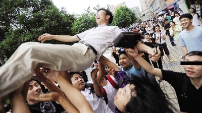 高考最后一門英語(yǔ)結(jié)束了,對(duì)緊繃的高三學(xué)生來(lái)說(shuō),這是一個(gè)歡樂(lè)的時(shí)刻,輕松的時(shí)刻。周南中學(xué)十幾名高三學(xué)生,剛走出長(zhǎng)沙一中考點(diǎn),便將班主任吳老師舉起拋向了空中。