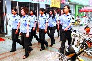 昨日,(江蘇)連云港市東?h女子城管隊(duì)員在縣城步行街巡邏。為充分發(fā)揮女性在城管執(zhí)法工作中特有的耐心、細(xì)心和善于溝通等特點(diǎn),著力打造城管行政執(zhí)法新亮點(diǎn),近日,連云港市東?h成立了城管行政執(zhí)法大隊(duì)女子中隊(duì)。該女子中隊(duì)目前共有10名隊(duì)員,主要負(fù)責(zé)在中心城區(qū)主干道進(jìn)行城管巡查,通過女性特有的親和力和感染力,化解執(zhí)法過程中出現(xiàn)的矛盾。