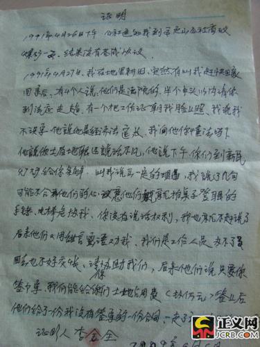 但事情到后來卻發(fā)生了變化——6月13日,再次來京的兩位舉報者帶來了李金全,李金全說:記者采訪時,自己介紹的其他情況都是真實的,但簽字一事沒有講真話。在調(diào)解書上,自己是簽了字的。以前,記者采訪時在這個問題上之所以沒有說實話,一是擔心承認自己當初經(jīng)不起法官的威脅和引誘,在損害集體利益的調(diào)解書上簽過字,村民們會瞧不起他這種軟骨頭。二是怕記者不敢碰硬揭露本案的內(nèi)幕,想以否定自己簽字的假情況引起記者重視。但如今記者要發(fā)稿了,為了對事實負責,所以愿意說出當時的真實情況。