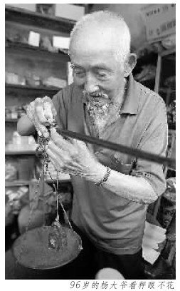 “大爺,幫我稱點(diǎn)白糖……”一名顧客喊道。只見老人從一大袋白糖中用勺子舀了一小袋,放在柜臺上的秤盤上,輕推秤砣。“一斤二兩!”老人喊道,“二元五一斤,一斤二兩三元!”這,恐怕只是96歲的楊大爺日常生活中的一個(gè)普通瞬間吧,記者尋思!按鬆,幫我拿包藍(lán)嬌嘛……”為了進(jìn)一步驗(yàn)證人們的說法,記者說道。“12元!”楊大爺從十幾個(gè)品牌的香煙中,準(zhǔn)確地拿了一包藍(lán)嬌放在柜臺上。“找你88元!”見記者拿了一張百元紙幣,楊大爺隨即回話。楊大爺把百元大鈔放到陽光下,細(xì)細(xì)查看水印,并不斷用手摸著紙幣的防偽標(biāo)志。確認(rèn)為真幣后,楊大爺迅速地給記者找了零錢。