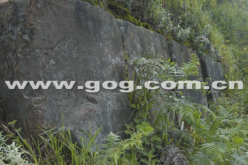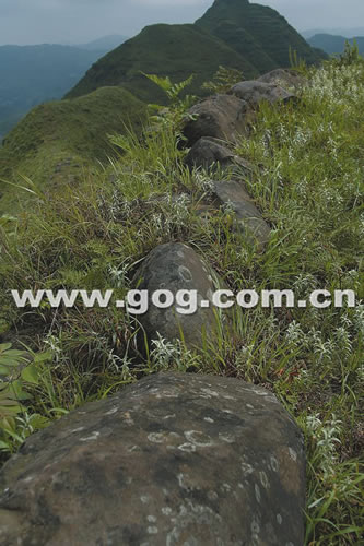 類似的排列巨石一直向東順著山脊兩側像長城一般蜿蜒近一公里,并且呈現(xiàn)出一定的排列規(guī)律:山崖南面堆砌的巨石體積巨大,且都是具有明顯的人工開采和打磨痕跡長方形或正方形石塊;而山崖北面的巨石幾乎都是未經打磨過的石塊,呈不規(guī)則形狀,并且在堆砌時不及南面巨石那樣講究和規(guī)整,但同樣是一線排開。在山峰腰部茂密的草叢中,同樣有一些整齊排列的巨型方石,且山腰還殘留有人搭建的石階。