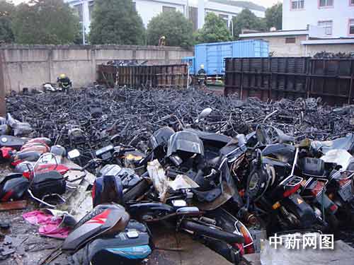 中新網(wǎng)寧波7月8日電(何蔣勇 歐陽峰)7日下午5時(shí)50分許,位于浙江省寧?h興寧中路45號(hào)的寧?h物資再生利用有限公司發(fā)生一起火災(zāi),濃煙沖天達(dá)百余米高,整個(gè)寧?h城都能清楚地看到黑煙滾滾。當(dāng)?shù)叵啦块T先后出動(dòng)四輛消防車、近四十余名官兵參與火災(zāi)撲救,約40分鐘后成功將大火撲滅,但是該公司露天堆場內(nèi)近百輛廢舊摩托車被大火燒成骨架。