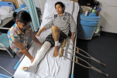 昨日下午,23歲的綦江男子楊傳華躺在重醫(yī)附一院骨科病床上,他的右腿打著夾板、纏著繃帶不能動(dòng)彈。他說(shuō),7月2日早上,他在渝中區(qū)六店子小學(xué)旁邊的樹(shù)林里鍛煉,學(xué)校保安誤認(rèn)為他是兩天前騷擾學(xué)校女老師的男子,將其腿打斷。至今,學(xué)校和保安未支付一分治療費(fèi)用,也沒(méi)有來(lái)看望和向楊道歉。