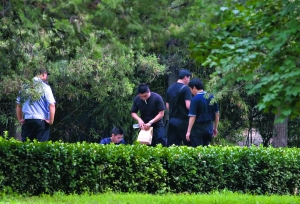 王明說,起初,藍衣男子出門后向東逃跑,跨進了銀行旁的綠化帶,然后向南前行了幾步,隨即馬上轉(zhuǎn)身,沿反方向跑去。到達銀行對面的綠化帶時,他和保安堵住了該男子。但藍衣男子沖著二人將瓶子里的無色液體灑出,隨后繞開他們,繼續(xù)向北跑去,很快就不見蹤影。