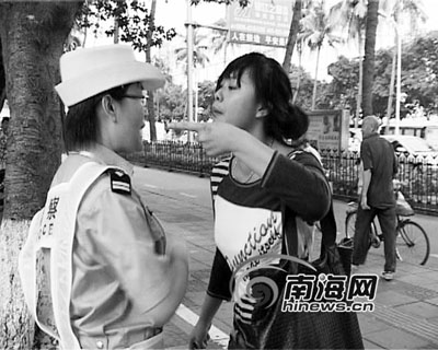 當(dāng)天下午4點(diǎn)45分,22歲女大學(xué)生小蕊走出銀龍影城橫穿6個(gè)車(chē)道后,在首力大廈被現(xiàn)場(chǎng)執(zhí)勤的海口交警攔下。當(dāng)交警告知她,翻越護(hù)欄橫穿馬路屬于交通違法行為需接受處罰時(shí),小蕊聲稱自己是第一次,身上也沒(méi)帶錢(qián),隨后便開(kāi)始“發(fā)飆”了。“你她媽的xx,我x你媽!边@名女大學(xué)生開(kāi)始對(duì)交警進(jìn)行辱罵。?谑薪痪ш(duì)一名負(fù)責(zé)攝像的工作人員對(duì)這一過(guò)程進(jìn)行錄像時(shí),女子一把抓過(guò)攝像機(jī)準(zhǔn)備砸在地上時(shí),被交警及時(shí)制止,“你要是砸了錯(cuò)就更大了”。