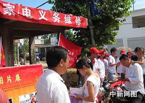 位卑未敢忘憂國(guó),作為一名大學(xué)生,我始終銘記這份責(zé)任和使命。適逢建國(guó)60周年,為深入開(kāi)展愛(ài)國(guó)主義教育活動(dòng),用自己所學(xué)來(lái)回報(bào)社會(huì),河南農(nóng)業(yè)大學(xué)機(jī)電工程學(xué)院組建了科技興農(nóng)服務(wù)團(tuán),赴河南省信陽(yáng)市固始縣汪棚鄉(xiāng)開(kāi)展了暑期“三下鄉(xiāng)”活動(dòng)。