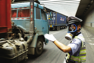 圖為昨天中午,寶山交警支隊(duì)民警何海清在外環(huán)隧道內(nèi)頭戴防毒面具值勤,外環(huán)隧道內(nèi)的汽車(chē)尾氣加上高溫天的熱度,能讓人窒息