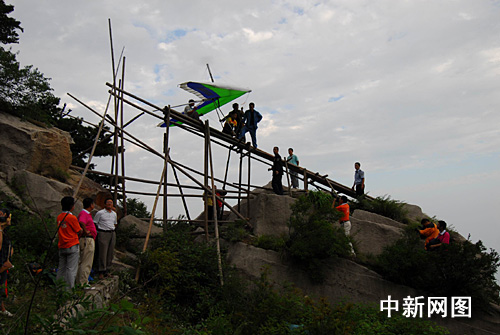 西岳華山,在全球華人的心中有著特殊的地位。金庸大師2003年10月登頂華山論劍,更使華山聲名遠播。海拔2082米的華山西峰為華山五大主峰之一,一塊完整巨石,渾然天成,絕崖千丈,似刀削鋸截,其陡峭巍峨、陽剛挺拔之勢是華山山形之代表。一般從事滑翔運動的愛好者自此飛躍而下并滑翔直線行程6公里。