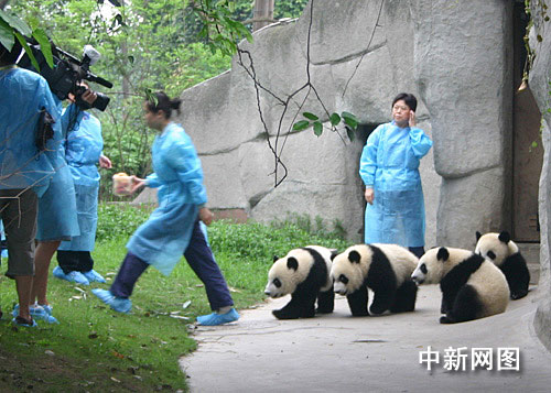 中新網(wǎng)成都7月22日電 (霍潺) 七月二十二日早上約八點半,成都大熊貓基地九個月大的大熊貓貝貝和同伴迎迎、大毛總共六只大熊貓在飼養(yǎng)員的陪同下歡快地跑出獸社,來到“幼稚園”玩耍。