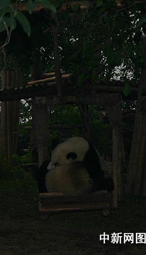 八點五十七分,成都陰悶的天空終于露出太陽的臉,但就在幾秒鐘,太陽像害羞的姑娘一樣又躲入云層。此時在幼稚園玩耍的六只大熊貓依然毫無異常反應(yīng),玩著水桶,相互嬉戲。