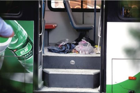 記者看到,公交車前車門處滿是灰色粉末,一條淡藍(lán)色牛仔褲、一袋蘋果和一些塑料袋堆在車門附近。附近居民猜測,那里正是嫌疑人意圖縱火的位置,“警察一直在那附近拍照,那些東西可能也是救火時(shí)留下的!