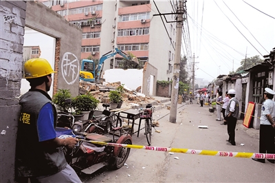 這處違法出租大院位于東木樨園11號(hào)樓和13號(hào)樓中間。昨天上午9點(diǎn)多,隨著豐臺(tái)區(qū)城管人員一聲令下,一輛小型挖掘機(jī)將吊臂揮向一堵墻面,墻面應(yīng)聲轟塌!澳憧,磚墻里都沒(méi)有水泥,只有沙土!必S臺(tái)區(qū)東鐵匠營(yíng)街道辦事處一名工作人員邊說(shuō)邊指給記者看,“這樣的房子出租,安全隱患太大了!辈鸪ぷ饕齺(lái)數(shù)十名居民觀看。聽(tīng)說(shuō)以后這塊地要建成健身場(chǎng)所,居民們都特別高興。一位大媽說(shuō),小區(qū)周圍沒(méi)有綠地,也沒(méi)有健身地方,居民們鍛煉一直特不方便。