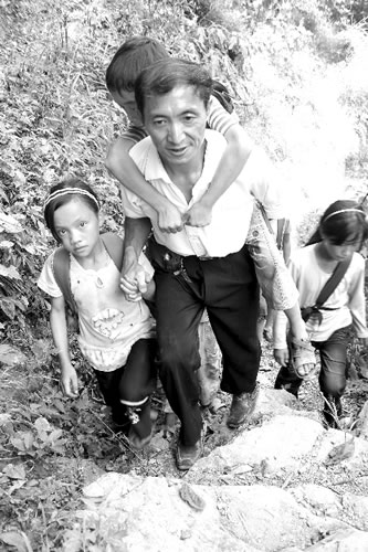 這是王正龍27年來唯一打的退堂鼓,仙峰苗族鄉(xiāng)中心校校長陳于強稱,對于王老師的“正常想法”,他們左右為難!拔疑岵坏煤⒆觽,但是我一個大男人靠工資吃不飽飯,我還要孝敬老人、養(yǎng)兒養(yǎng)女!”王正龍的話“刺痛”了陳于強。“你不代課了,一時沒人接替你,我們只好撤掉兩個年級,有條件的孩子只能下山來讀!标愑趶姵聊艘魂嚭笳f。 “下山來讀?說得輕巧!蓖跽埣绷,這樣肯定有70%的孩子會輟學,“我繼續(xù)教吧!山區(qū)的孩子不能沒有老師!”長嘆一口氣,王正龍又爬山路返回村小。