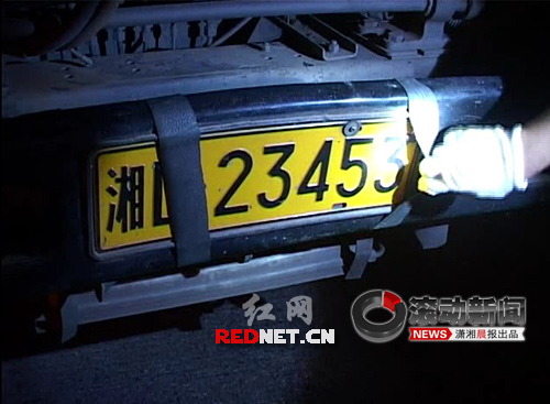 隨后,民警又?jǐn)r下一輛大貨車。這輛車不僅車尾沒(méi)有懸掛號(hào)牌,前面也做了手腳。司機(jī)用兩副皮筋遮住了前牌照,遮住了末尾一個(gè)數(shù)字,還在歸屬地來(lái)了個(gè)“貍貓換太子”,湘D變成了湘L!