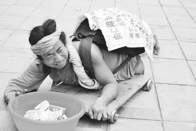 下午4時許,中年男子將自行車藏在樹后,變成一名衣衫襤褸的乞討者出現(xiàn)在眾人眼前。他趴在一個木板上,木板下邊有4個小輪子,他用胳膊和右腿支撐地面,身體通過滑板向前滑動。他的背上還貼著一張寫有“痛苦家世”和“悲慘往事”條幅。他滿臉淚痕,伴著嗚嗚的哭聲,引來很多行人關注。記者看到,短短5分鐘內(nèi),就有十幾名市民把錢放入他面前的塑料盆中。