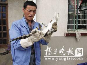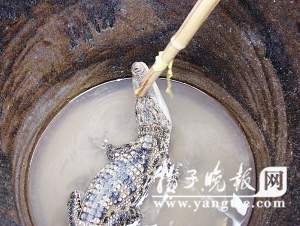 昨天上午,記者接到市民董先生的報料來到了江寧谷里孝義村111號,周國喜正蹲在一個大缸前,旁邊還有幾位村民在指指點點。記者走近一看,只見一只長約80厘米的小鱷魚正在缸底,頭部往上翹,尾部不停地甩動,看上去很緊張。盡管這條小鱷魚給周國喜帶來了不小的損失,可他沒有絲毫的恨意,反倒細心照顧起來!斑@個魚塘我一直在養(yǎng)魚,每年2月份和6月份都投放一次魚苗,總共1萬多條,鳊魚、鯽魚都有!敝車舱f,可讓他奇怪的是,產(chǎn)量都不高。周國喜曾研究過多次,可沒有任何結果,這讓他百思不得其解?删驮诮衲8月份的時候,周國喜在清理魚塘時,突然發(fā)現(xiàn)一只小怪物伸出了頭,嘴巴長又尖。“就是它了,我當時確定魚塘產(chǎn)量不高就是因為這只小怪獸!敝車哺嬖V記者,他自此開始盯著魚塘,可小怪獸很警惕,大都在魚塘底,很難發(fā)現(xiàn)。功夫不負有心人,通過近半個月的觀察,周國喜發(fā)現(xiàn)小怪獸喜歡上岸睡覺,不過是在對岸的水花生上面,很難捕捉。“尾巴很長,嘴很尖,身上顏色黃黑相間。”周國喜說第一眼看到小怪獸就覺得像是鱷魚,不過他不敢確認,于是喊來了弟弟,結果弟弟覺得像是國家一級保護動物揚子鱷。