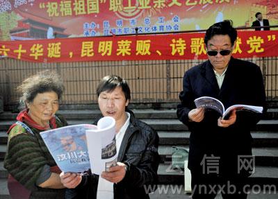 “黨!偉大的黨,60華誕的今天,我為您歌頌不朽的贊歌寫下您愛民的詩篇……”鄧成友的朗誦吸引了不少男女老少駐足傾聽。