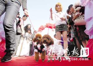 昨天,兩只身穿結(jié)婚禮服的寵物狗正在領(lǐng)取結(jié)婚證。當(dāng)天,南京首屆寵物集體婚禮在南京綠博園內(nèi)舉行。15對寵物狗“新人”伴隨著婚禮進(jìn)行曲逐對踏上紅地毯。狗狗們不但領(lǐng)取到寵物結(jié)婚證書,還互相贈送了愛情信物。據(jù)悉,寵物集體婚禮在南京尚屬首次,別開生面的婚禮現(xiàn)場吸引了不少市民前來捧場。圖為一對可愛的泰迪犬夫妻領(lǐng)到了結(jié)婚證。 (周曼 宋嶠)
