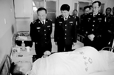 10月16日,省公安廳副廳長、市公安局局長王幸等領導專程趕往醫(yī)院,親切看望和慰問了在抓捕毒販中英勇負傷的禁毒大隊大隊長徐光明。在病房,王幸對徐光明、李剛、劉紅生、王麗萍4名民警的行為給予贊揚,并囑咐他們好好養(yǎng)傷,爭取早日康復。