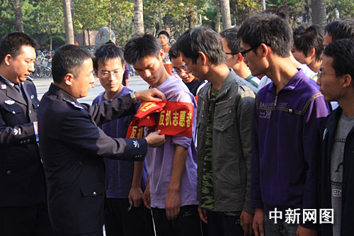 中新網(wǎng)鄭州10月23日電 (記者 晏立海 馬雯雯)10月23日下午,鄭州市反扒支隊(duì)一大隊(duì)的反扒高手們來到河南農(nóng)業(yè)大學(xué),教授百名學(xué)生反扒技巧。這是鄭州市公安局反扒支隊(duì)向社會招聘2000名大學(xué)生反扒志愿者的首批學(xué)員,這些大學(xué)生們經(jīng)過培訓(xùn),10月24日將走上街頭協(xié)助反扒民警抓小偷。