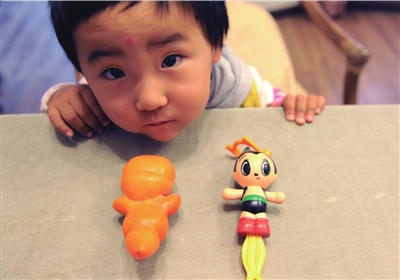 據(jù)楊女士介紹,上周末,她帶著2歲的女兒家奕到農(nóng)村去采摘,“孩子牙還沒長齊,正好喂軟柿子吃”。在柿農(nóng)為其采摘時,家奕在一旁往樹上看,“她用手指著,嘴里嘟囔著什么。”這個柿子被摘下來,柿農(nóng)說它像人參果,就把它送給了家奕!盎貋淼穆飞,家奕就一直在玩那個柿子,嘴里還是嘟囔著!被氐郊遥肄饶贸觥拌F臂阿童木”的玩偶,楊女士才知道,原來,家奕一直在說那個柿子像“阿童木”。楊女士說,“這個‘柿子阿童木’都已經(jīng)軟了,但是,如果放進冰箱凍起來,家奕玩不到就會哭的。” (實習記者李川)