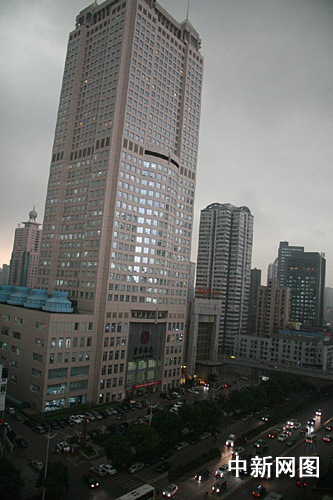 芙蓉路上不少高層寫字樓里的白領(lǐng)還趕緊跑到窗戶前,查看外面的動靜。記者站在長沙城區(qū)中心的某寫字樓俯瞰,整個城市黑云壓境,由于天色陰沉,能見度低,不少道路兩旁的路燈都已經(jīng)提前點亮,行駛在路上的汽車紛紛開啟了前后燈。