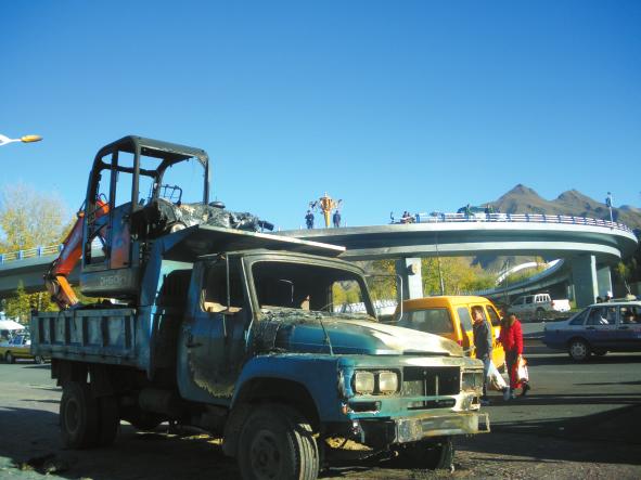 記者在事故現(xiàn)場看到,一輛被燒成空架的東風(fēng)車及被燒過的裝載機(jī)放置在路邊,立交橋的欄桿已被撞出一個寬大的口子,橋下3柱景觀路燈也被燒壞。橋下地面還殘留著大片油漬,旁邊被大火殃及的工商部門辦公樓燒毀嚴(yán)重。清理現(xiàn)場的工作人員正在對一些危險建筑物進(jìn)行拆除,并對現(xiàn)場油污進(jìn)行清理。