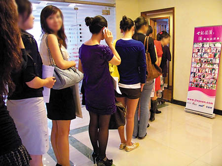 記者在面試現(xiàn)場看到,當(dāng)天前來應(yīng)征的靚女當(dāng)中,絕大多數(shù)在首輪就被淘汰,進(jìn)入到第二輪的只有五名。這五名中又有三位在過第三關(guān)———面談關(guān)時(shí)被淘汰了,只有兩人獲得與富豪見面的機(jī)會。三位靚女被淘汰的原因很簡單,一位因家里是母親做主,被認(rèn)為“太強(qiáng)勢”,不合要求;一位因有“許多個(gè)男性朋友”,被認(rèn)為用情太泛、不專一,被淘汰;還有一位是因?yàn)榇虬绮坏皿w、談吐大大咧咧,也被認(rèn)為不合要求。 應(yīng)征動(dòng)機(jī),多否認(rèn)“逐富”