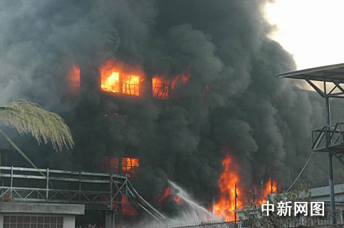 記者在現(xiàn)場看到火光沖天,滾滾濃煙躥起有兩百米高,方圓一公里內可聞到陣陣焦味。離火災現(xiàn)場數(shù)米之隔,則是茂名華粵勞保用品公司生產(chǎn)車間,工人正在緊急轉移物資,以防火災蔓延。