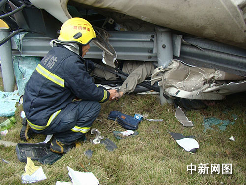 接警后,30多名消防救援人員迅速趕赴現(xiàn)場。10時(shí)13分許,救援人員趕到事故現(xiàn)場。一輛車牌為閩A25785的加長大貨車撞斷高速護(hù)欄后,側(cè)翻在路邊,車頭已經(jīng)面目全非,車體嚴(yán)重扭曲變形,從車身外部清楚可見變形駕駛室與地面之間有一名男子被死死卡住,動(dòng)彈不得,臉色蒼白,另一名人員被卡在駕駛室內(nèi),生死不明,情況十分緊急。而且側(cè)翻導(dǎo)致油箱破裂,油箱里的柴油已經(jīng)流了一地,情況十分緊急,急需救援。