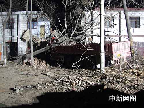 今日凌晨2時(shí)06分,河南新鄭消防部門接報(bào)后,救援人員立即趕赴現(xiàn)場,只見一輛大貨車已經(jīng)深深扎入一棟掛著汽車修理店門牌的二層樓房內(nèi),樓前一棵直徑約60公分的大樹被撞斷,大樹的樹身偏移樹根約有五、六米遠(yuǎn),正壓在貨車的車身上。此時(shí)的修理店已經(jīng)坍塌了一大半,大量的水泥樓板、磚頭覆蓋了貨車的車頭。