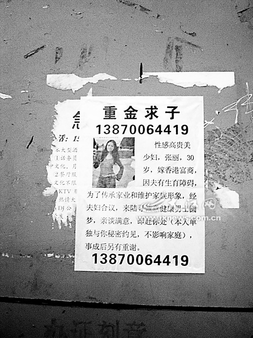 沒(méi)費(fèi)多少時(shí)間,記者便在某臨街店面的外墻上看到了這則廣告,內(nèi)容為“性感高貴美少婦,張麗,30歲,嫁香港富商,因夫有生育障礙,為了傳承家業(yè)和維護(hù)家族形象,經(jīng)夫婦合議,來(lái)陸尋誠(chéng)意健康男士圓夢(mèng),親談滿意,即赴你處(本人單獨(dú)與你秘密約見(jiàn),不影響家庭),事成后另有重謝”,廣告上還配有一張美女全身照,更是吸引了不少市民的眼球。圍觀市民為此議論紛紛,有的說(shuō)可能是真的,現(xiàn)如今無(wú)奇不有;還有的說(shuō),這種事怎么可能廣而告之,肯定是騙子設(shè)的圈套。