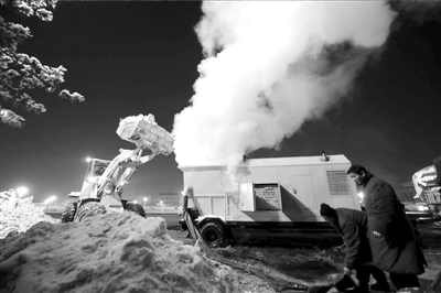 昨天凌晨,在人民大會堂東側(cè)路,環(huán)衛(wèi)集團(tuán)的新武器“融雪屋”正在進(jìn)行“吃雪”作業(yè)。鏟車每隔幾分鐘就向“融雪屋”內(nèi)倒入一鏟積雪,隨著一陣白色霧氣升起,積雪就被融雪屋“吃”掉,變成水流進(jìn)了市政管線。從外表看,“融雪屋”就是一個橘黃色的方形體。負(fù)責(zé)操作的高師傅說,不要小瞧這個機(jī)器,它每小時能融雪25噸!跋襁@樣低的溫度,即使融雪劑與積雪充分混合,靠自然溫度融化減量也有一定困難,所以我們投入使用了這個新設(shè)備,加快積雪融化!北本┉h(huán)衛(wèi)集團(tuán)作業(yè)部部長張志強(qiáng)說!