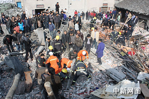 當日下午13時14分,瑞安市消防大隊接到報警后,迅速調(diào)集公安現(xiàn)役消防隊及專職消防隊6輛消防車30名指戰(zhàn)員趕到現(xiàn)場實施救援。消防官兵到達現(xiàn)場時,現(xiàn)場一片狼藉,百余平方米的房屋已成為廢墟,現(xiàn)場嘈雜聲混成一片,爆炸現(xiàn)場多處起火,火魔開始向倒塌民房蔓延,而廢墟下面有多條生命等待著救援,現(xiàn)場情況十分危急。消防官兵立即出兩支高壓水槍對火勢進行控制,同時救援小組迅速展開營救。