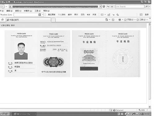盡管公開信息顯示,石家莊市裕華區(qū)人民法院已于2009年9月對(duì)蔡國海作出了有期徒刑3年緩刑5年的判決,但2010年1月26日,記者還是在中國記者網(wǎng)的“記者證查驗(yàn)系統(tǒng)”中找到了蔡國海的名字。查詢結(jié)果顯示,蔡國海的記者證辦證日期為2009年8月,并通過了這一年的年度核驗(yàn)。在中國記者網(wǎng)“新聞機(jī)構(gòu)”查詢系統(tǒng)中,蔡國海仍是《消費(fèi)日報(bào)》河北記者站的記者。