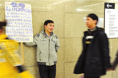 一根木棍支起一張手寫的大海報,開頭寫著“征婚”二字,海報上坦言“沒有固定工作,也沒有豐厚的積蓄”。春節(jié)將至,一個河南小伙前天下午在大望路地鐵站通道里,征求“裸婚”對象。雖然側(cè)目者眾,但應(yīng)征者寥寥。