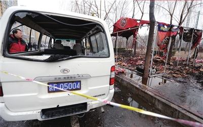 事發(fā)后,豐臺警方立即趕到現(xiàn)場。大紅門、右安門兩支消防隊(duì)9輛消防車到場救援。6點(diǎn)15分左右,現(xiàn)場大火被基本撲滅。昨天上午7點(diǎn),記者在現(xiàn)場看到,地上布滿了煙花殘屑,20多平米的煙花大棚只剩下支撐的鐵架子,棚內(nèi)存放的煙花和遮棚布全被燒光。福田面包車的車窗玻璃被炸碎,車內(nèi)一片狼藉。周圍多輛轎車被波及,有一輛車的輪胎外側(cè)金屬圈被炸飛,多輛車的車身被炸花。