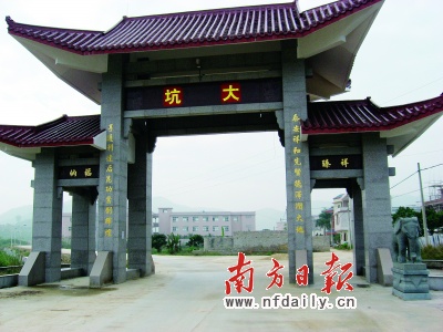 大坑村是一個偏遠的革命老區(qū)村。從鎮(zhèn)場輾轉(zhuǎn)乘車幾公里,遠遠可見青瓦大理石牌坊高聳于村口,上面紙貼的“大坑”二字顯得粗糙而扎眼。
